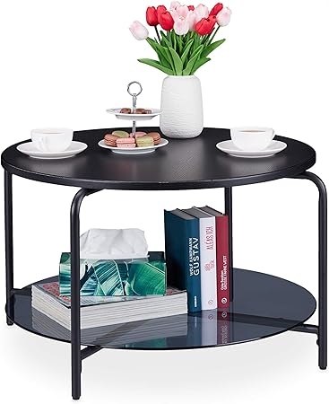 Relaxdays Mesa Auxiliar Redonda Con 2 Superficies Mesita Centro Baja Metal Dm Cristal 45 X 80 Cm Negro Amazon Es Hogar